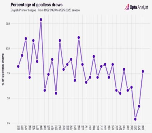 过度看重定位球战术,导致英超0比0比赛数量上升。本赛季英超已有19场0比0的比赛,超过2024/25赛季(16场)和2023/24赛季(11场),白卷比赛占比(6.8%)也连续3个赛季上升。白卷场次增加与进球数下降正向相关,各队痴迷定位球得分,导致射门数也在下降。本赛季场均射门次数(24.4次),是2003/04赛季以来第二低,仅高于2020/21赛季(场均24.2次)。那个赛季因疫情,大部分比赛球员发挥都低于预期。