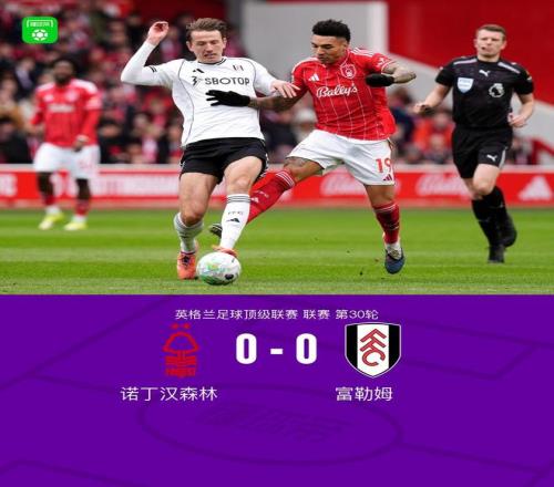 北京时间3月15日22:00,英超第30轮,诺丁汉森林主场对阵富勒姆。上半场双方均无建树,下半场,恩多耶进球被吹越位,埃纳爆射击中门框。最终诺丁汉森林0-0战平富勒姆。