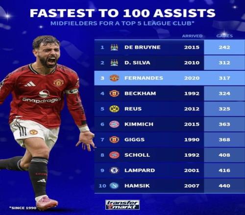 3月1日,曼联在英超主场2比1逆转水晶宫,费尔南德斯先是点球扳平,随后又送出任意球助攻,直接参与了球队的两粒进球。这场比赛打完,他也正式把自己在曼联的助攻数刷到了100次,而且只用了317场。最新这场球刚把他的组织价值又顶出来,转头再看这份“五大联赛俱乐部中场最快100助攻榜”,第三的位置就更有看头了:前面是德布劳内和席尔瓦,后面跟着贝克汉姆、罗伊斯、基米希这些名字,B费能挤进这一档,已经不只是数据好看那么简单。