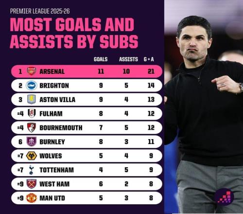 Opta列出了本赛季英超球队替补球员参与进球榜,阿森纳以21球居首,领先第二名的布莱顿7球,曼城以2球垫底。