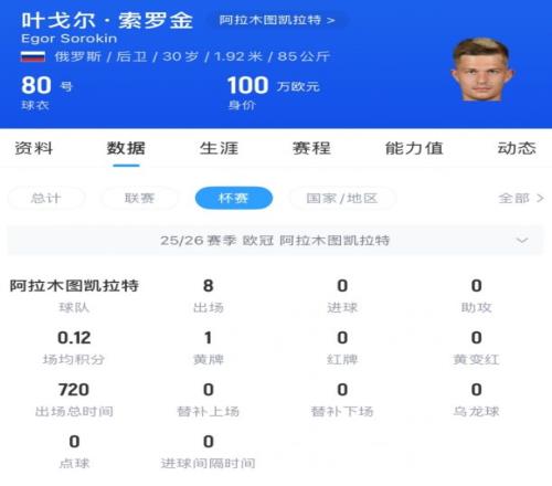 数据显示,索罗金此前效力于阿拉木图凯拉特俱乐部,并且一直担任主力中卫。本赛季,索罗金已经踢了8场欧冠资格赛和8场欧冠正赛,他的解围和高空对抗能力比较突出,算得上是一名不折不扣的欧冠级球员。