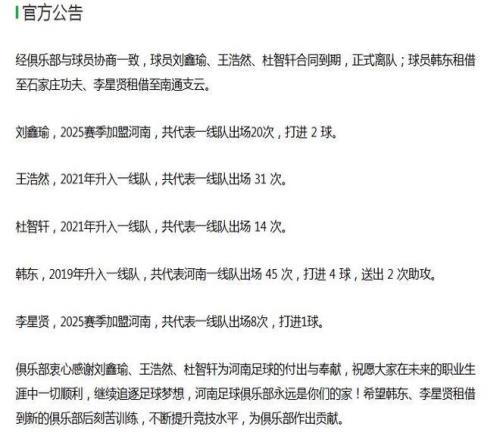 这番操作最亮眼的地方,在于俱乐部思路非常清晰,续约6名球员保住下限,引进强力内外援提升上限。另外,河南队还官宣,刘鑫瑜、王浩然、杜智轩三名球员合同到期,正式离队。球员韩东租借至中甲俱乐部石家庄功夫、李星贤租借至中甲俱乐部南通支云。