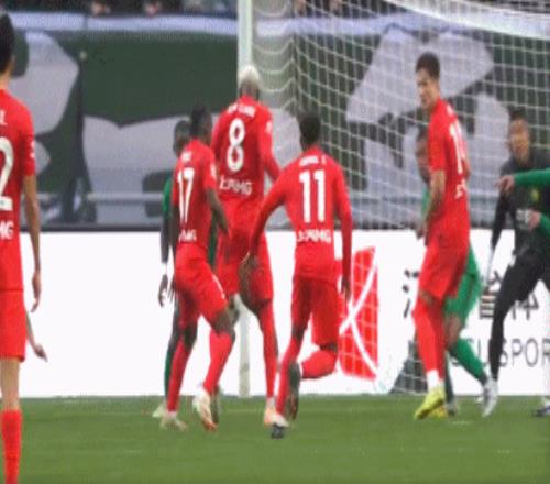 面对北京国安,杨希、克劳德、卢永涛、安永佳、安佩姆五名新援首发出场。比赛第29分钟,达万大脚解围,球打在恩科洛洛身上反弹击中门柱。