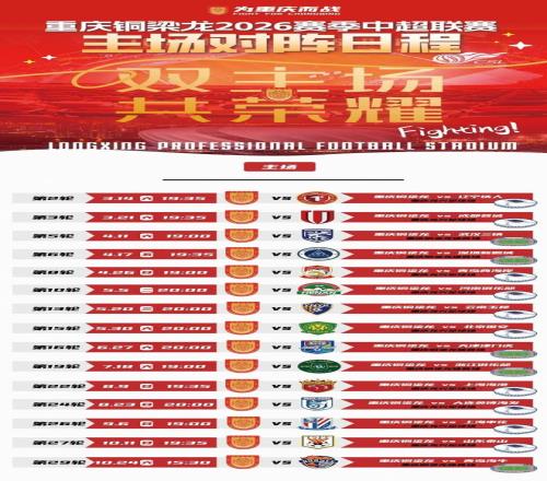 2026赛季中超联赛重庆铜梁龙主场赛程。 重庆铜梁龙俱乐部供图
