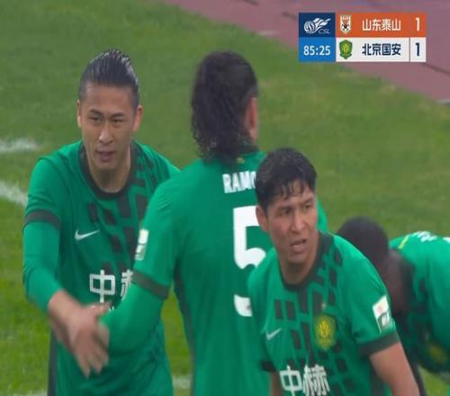 比赛来到下半场,泰山队立刻换人调整:彭啸出战换下高准翼。第49分钟,泰山队进球了:国安的后防线已经基本就位,但是泰山队球员三传两导将球给到右路的谢文能,后者劲射破门!