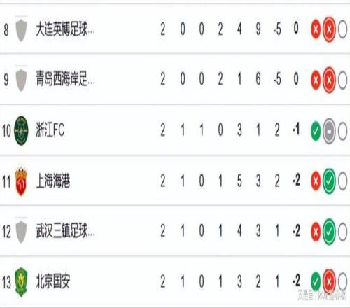 而积分榜下游球队的处境就要艰难得多,上海申花、青岛海牛、天津津门虎仍然排在积分榜倒数三位。其中申花虽然取得1胜1平的战绩,但因为开赛前被扣掉了10分,现在积分仍然是-6分。青岛海牛和津门虎的情况就更糟糕了,一个-7分,一个-9分,想彻底摆脱负分的尴尬,至少还需要三场比赛的胜利。