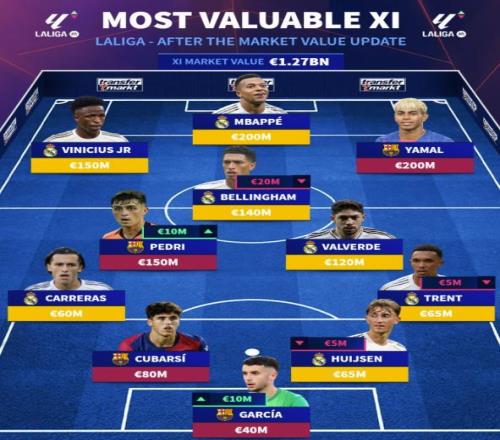 北京时间3月16日,德转更新了新一期西甲球员的身价,随后德转也是列出了西甲联赛在433阵型下的最贵阵容,皇马和巴...