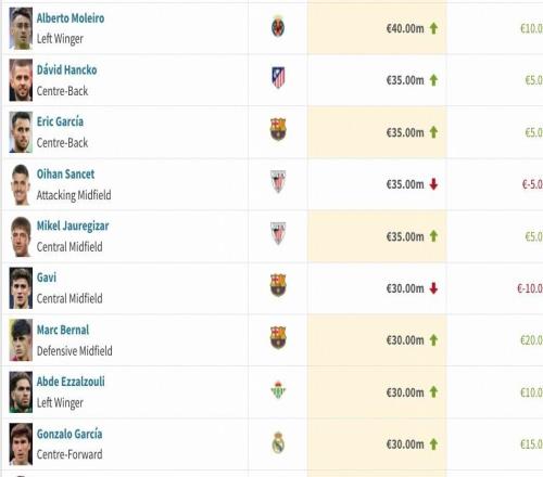 西甲身价更新:费尔明暴涨3000万欧升至1亿,贝林下降2000万欧