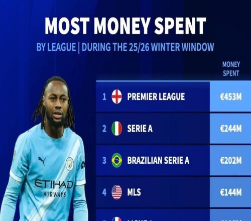 北京时间2月3日,德转统计出了2026年冬窗转会支出最高的10个联赛,英超以4.53亿欧元断档领先,意甲2.44亿欧元第二...