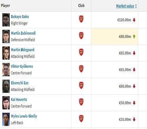 阿森纳8人身价变更:仅苏比门迪上涨,萨卡&厄德高跌1000万欧
