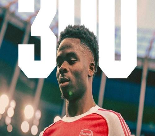 24岁180天,萨卡是达成阿森纳生涯300场第四年轻的球员
