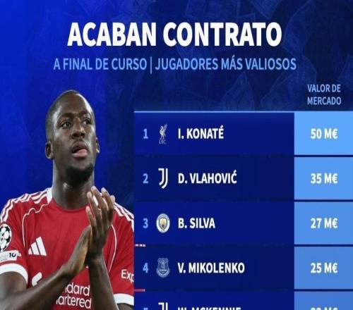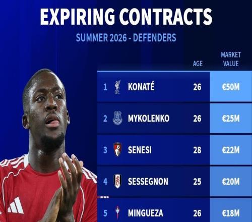北京时间2月20日,德转列出了现有合同今年6月到期德转身价最高的10名球员,利物浦中卫科纳特以5000万欧元排名第...