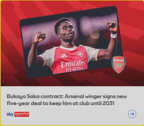 名记:萨卡已经与阿森纳续约至2031年,周薪超过30万镑