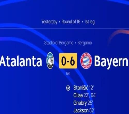 北京时间3月11日,在欧冠1/8决赛首回合的比赛中,亚特兰大在开场67分钟过后就被拜仁慕尼黑打进6球,目前在主场0-6...