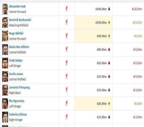 利物浦11人身价变更:索博1500万欧涨幅最大,伊萨克跌幅最大