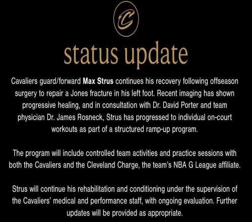 骑士官方:斯特鲁斯恢复情况良好,接下来将逐步开启有球训练