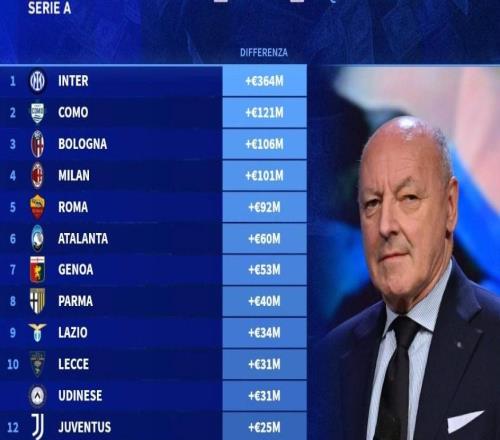 意甲球队阵容成本和现有价值差价榜:国米第一,那不勒斯垫底
