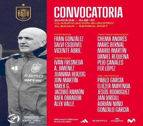 北京时间3月20日,西班牙U21国青队公布了新一期大名单,巴塞罗那中场马克-贝尔纳尔和皇家马德里前锋贡萨洛-加西...