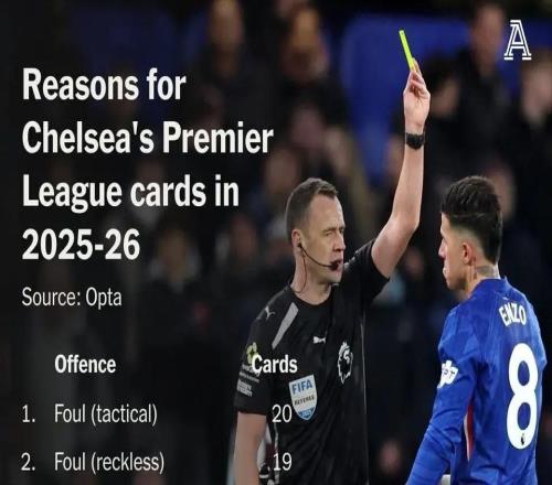 切尔西本赛季英超吃牌原因排行:战术犯规20张,表达异议10张